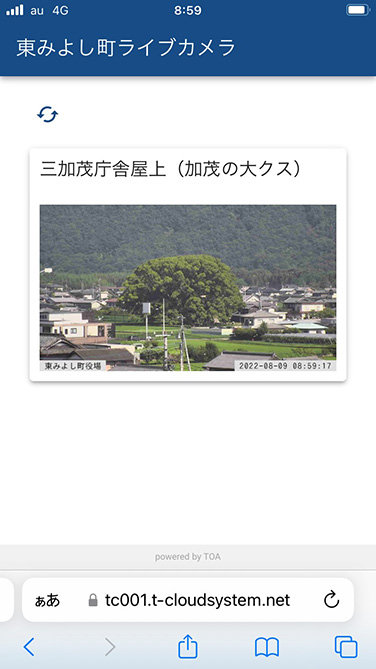 TRIFORA Webサービスの公開用ページ(左はPCでの表示、右はスマートフォン表示)。東みよし町HPのライブカメラページより直接リンクしている。画面は三加茂庁舎屋上から加茂の大クス方面を撮影した静止画。