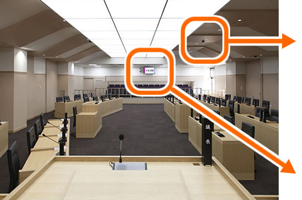 指向性の高いマイクユニットやデジタルプロセッサーのハウリング抑制機能により、明瞭性の高い音環境を実現。傍聴席上には広指向性の天井埋込型スピーカーも設置していますので、音響面でも聞きやすい環境になっています。また、SD/USBソリッドステートレコーダーによるクリアな音質での録音データがSDカードなどで取り出せるので、会議録の作成も便利になっています。カメラ映像は庁舎内の大型モニターやTVなどに配信され、議会の見える化、情報公開に貢献しています。